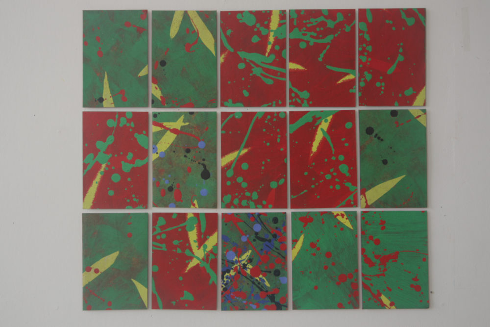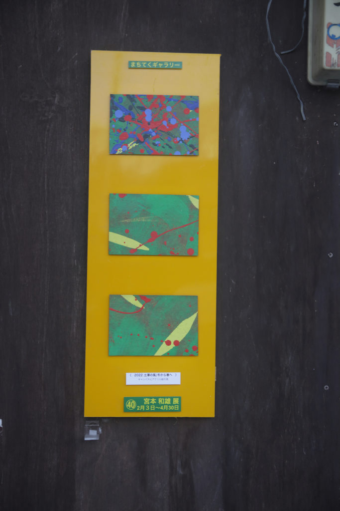 その宮本さんの作品は、今回の「まちてくギャラリー」に送ってくれたものは、2014年の「街かど美術館」で神社の境内にある土俵の妻に大きな作品を展示したのですが、それは一番上の写真にあるように赤と緑のコントラストに黄色い葉っぱ状の点が散らばるものでした。強いコントラストに黄色い色が間に割って入る、色彩の「コントロール」のように思いました。