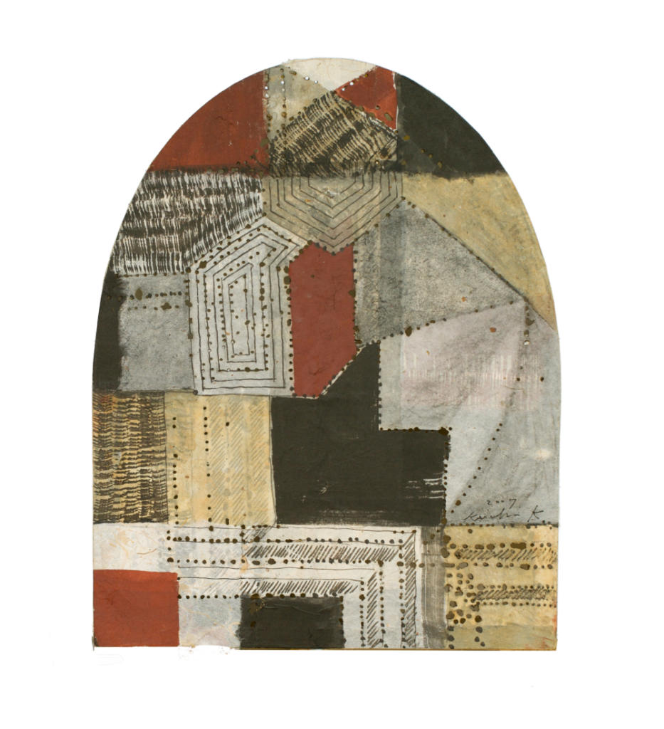 この作品は木の枠に貼った和紙に描かれていて、その線を拒否するかのように点々で線を消し去っているかのようにも見えます。しかも、その点々は線香で焼いて開けた穴なのです。その疑似的な線に囲まれた面をいろいろな塗り方で変化をさせています。