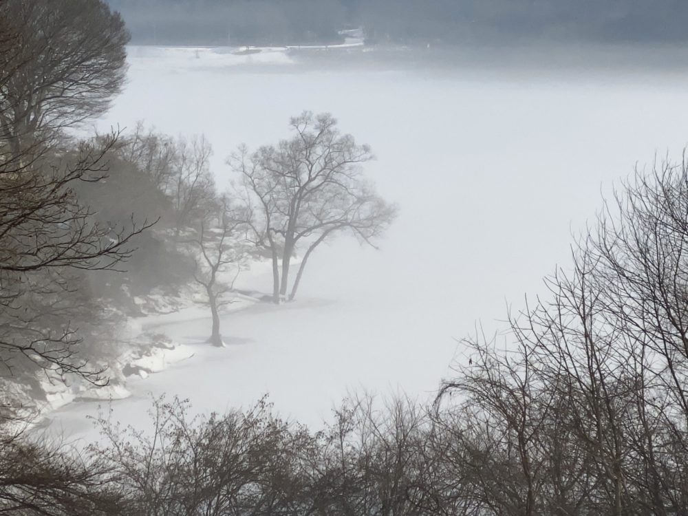 田瀬湖が凍って上に雪が積もり寒い朝、湖面に霧が立ちこめて幻想的な景色になっていました。湖面の水はダムの管理で常に水量が変わるのですが、この時期水は減らされ始めているようで、水面が下がると氷も低くなり岸には取り残された氷がひび割れてへばりつくようになるのですが、それもまだあまり見えません。